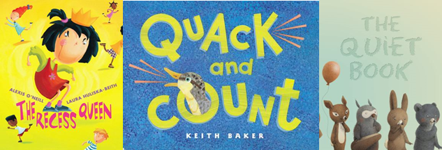 I had a really hard time coming up with this week’s storytime outline. Some alphabet letter’s do not lend themselves to alphabet-centric storytimes! I spent a long time scouring the web, various OPACs and A to Zoo to find related picture books and extension activities. My preschoolers at the child development center loved The Recess Queen. Quack and Count went over well, but I got the impression the math was a bit advanced for their age group (they’re between the ages of 3-4 years old). The extension activities were a success. The kids were delighted by my buck toothed, mouse finger puppet (part of a set my father purchased from IKEA as a gift) and demanded I perform Quiet Mouse multiple times. They had a blast using the shakers and pom-poms, did not hesitate to create a cacophony of sounds. We concluded storytime with selected readings from The Quiet Book, which I read in a mock whisper while my preschooler’s “shushed me.”
