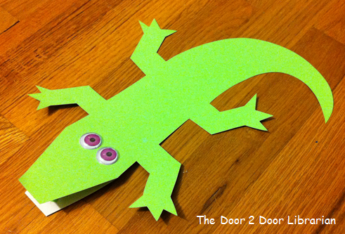 I came across the inspiration for this craft last year while exploring Pinterest. However, the original comes from the blog, Skip to My Lou. In order to create my simplified version, I first created a set of templates for the body, lower jaw, and teeth. I used the templates to trace everything out on bright green colored cardstock and white printer paper. Then I cut everything up prior to storytime. I paper clipped each set of craft pieces and then handed out pair of googly eyes. My munchkins really liked this craft and had a blast snapping at one another.